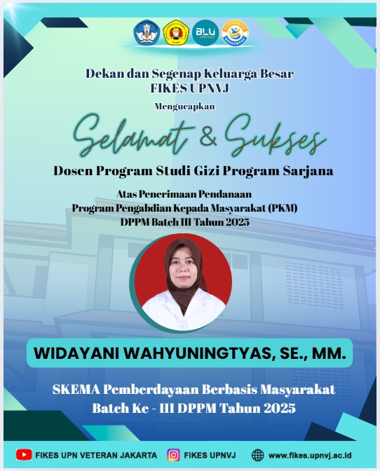 FIKES UPNVJ – Dekan dan Segenap Keluarga Besar FIKES UPN "Veteran" Jakarta mengucapkan Selamat dan Sukses Kepada Dosen Program Studi Gizi Program Sarjana Widayani Wahyuningtyas Atas Penerimaan Pendanaan Program Pengabdian Kepada Masyarakat DPPM Batch III Tahun 2025.