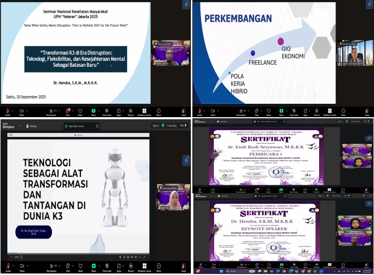 FIKES UPNVJ – Telah diselenggarakannya Seminar Nasional Kesehatan Masyarakat FIKES UPN “Veteran” Jakarta 2025 pada Sabtu, 20 September 2025 secara online melalui platform Zoom Meeting. Kegiatan ini mempunyai tema, yaitu “When Safety Meets Disruption: Time to Rethink OSH for the Future Work”. Adapun tujuan dari kegiatan ini, yaitu meningkatkan pemahaman peserta mengenai transformasi Keselamatan dan Kesehatan Kerja (K3) dalam menghadapi era disrupsi teknologi, fleksibilitas kerja, dan pentingnya kesehatan mental sebagai frontier baru dalam dunia kerja modern. Kegiatan Seminar Nasional Kesehatan Masyarakat UPN “Veteran” Jakarta 2025 diikuti oleh pelajar, mahasiswa, dan masyarakat umum di berbagai daerah di Indonesia. Kegiatan ini dipandu oleh Master of Ceremony (MC) Dian Mardiana Lestari dan moderator yaitu Farahul Jannah, S.Kep., M.K.K.K.