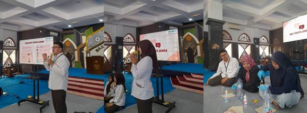 Setelah sesi sambutan, peserta mengikuti pre-test untuk mengetahui tingkat pengetahuan awal mengenai kebencanaan kebakaran. Kegiatan kemudian dilanjutkan dengan penyampaian materi yang mencakup definisi kebakaran, faktor penyebab, jenis-jenis kebakaran, dampak yang dapat ditimbulkan, serta langkah-langkah penanggulangan kebakaran. Penyampaian materi dilakukan secara interaktif oleh Dinda Vladys Claudya, S.Kep. dan Rahman Aziz Haditama, S.Kep., disertai dengan demonstrasi pembuatan Alat Pemadam Api Sederhana (APAS) yang menggunakan bahan rumah tangga seperti soda kue, cuka, dan air, sehingga mudah diterapkan oleh masyarakat di rumah masing-masing. Materi ini bertujuan untuk meningkatkan keterampilan praktis peserta dalam melakukan tindakan awal terhadap api kecil sebelum berkembang menjadi kebakaran besar.