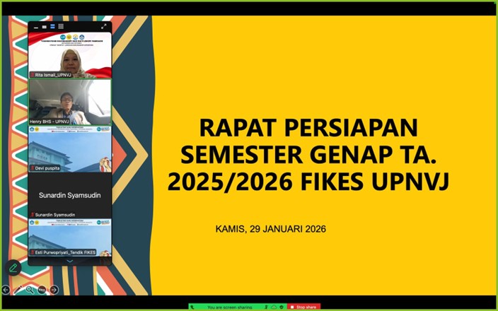 FIKES UPNVJ – Fakultas Ilmu Kesehatan Universitas Pembangunan Nasional “Veteran” Jakarta (FIKES UPNVJ) menggelar Rapat Persiapan Perkuliahan Semester Genap Tahun Akademik 2025/2026 pada hari Kamis tanggal 29 Januari 2026. Rapat ini diikuti oleh Wakil Rektor Bidang Akademik selaku Plt. Dekan FIKES, Para Wakil Dekan, Para Ketua Jurusan, Para Sekretaris Jurusan, Para Koordinator Program Studi, Para Koordinator Sekretariat dan Pengembangan Program Studi, Para Ka. Laboratorium, Ketua GKM, Sekretaris GKM, Para Dosen, Koordinator Tata Usaha, Sub Koord Akademik dan Kemahasiswaan, Pengolah Data Akademik, Para Administrasi Program Studi, guna memastikan kesiapan penyelenggaraan pembelajaran sesuai ketentuan akademik yang berlaku.