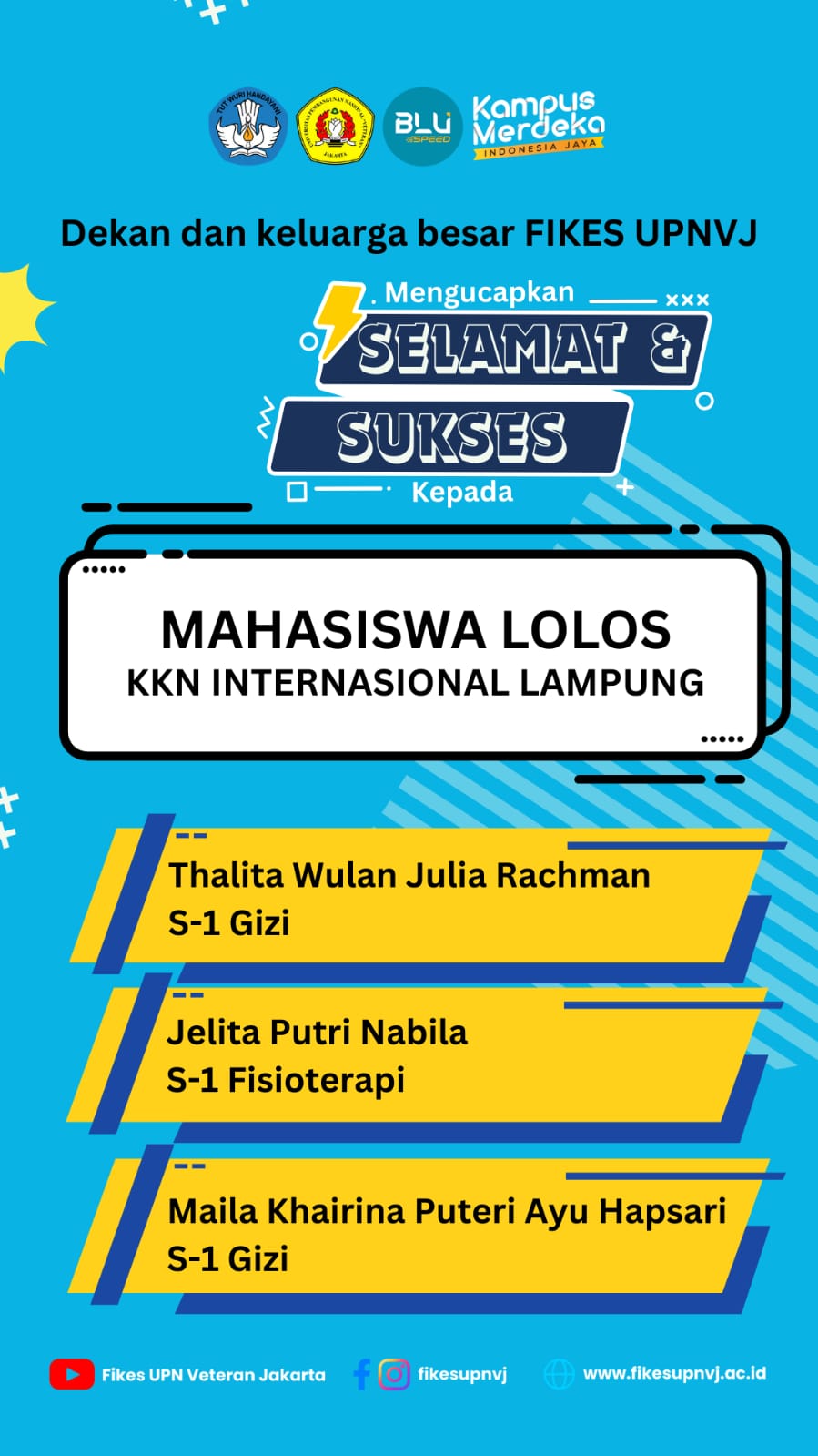 FIKES UPNVJ – Dekan dan Keluarga Besar Fakultas Ilmu Kesehatan UPN "Veteran" Jakarta Mengucapkan Selamat dan Sukses Kepada Mahasiswa yang Lolos dalam KKN Internasional Lampung yaitu : 1. Program...