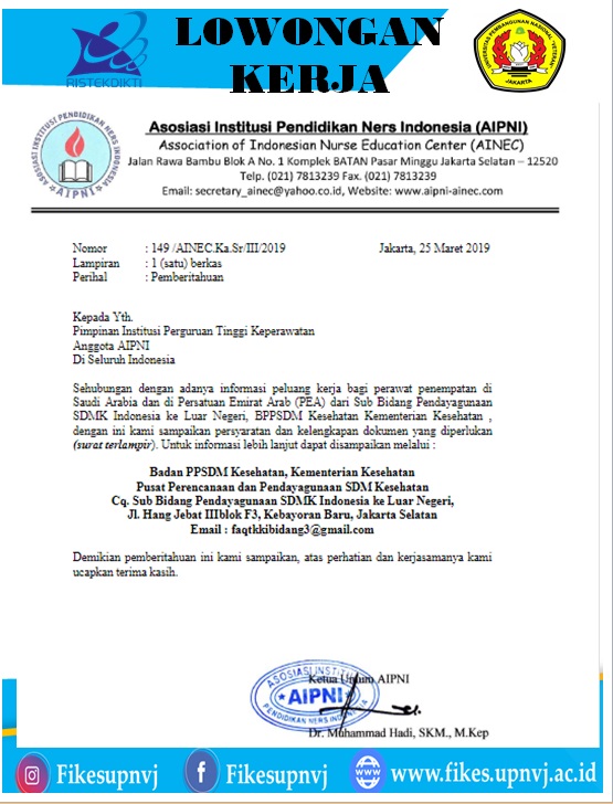 Kepada Yth. Pimpinan Institusi Perguruan Tinggi Keperawatan Anggota AIPNI Di Seluruh Indonesia Sehubungan dengan adanya informasi peluang kerja bagi perawat penempatan di Saudi Arabia dan di Persatuan Emirat...