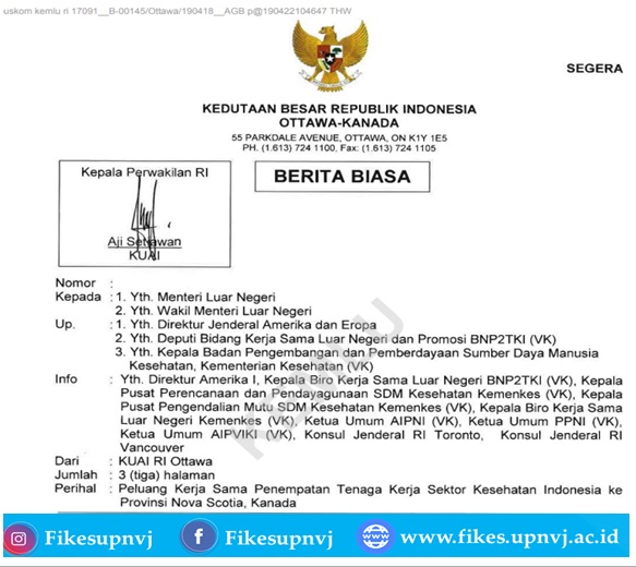Kepada Seluruh Alumni Bidang Kesehatan berikut dilampirkan Peluang Kerja Sama Penempatan Tenaga Kerja Sektor Kesehatan Indonesia ke Provinsi Nova Scotia, Kanada