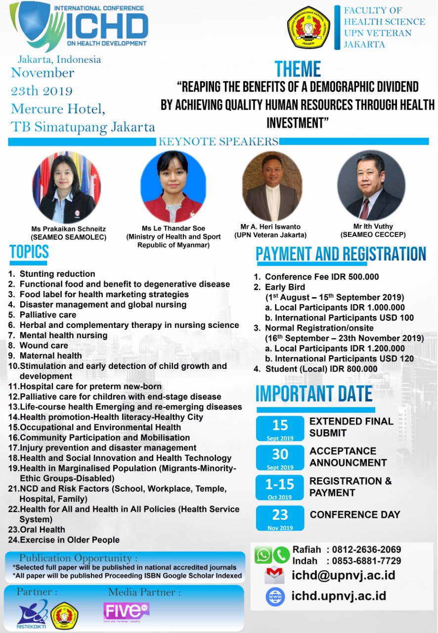 Call for abstract! Extended until September 15th, 2019 International Conference on Health Development (ICHD) is an international conference organized by Faculty of Health Science, Universitas Pembangunan Nasional Veteran Jakarta....