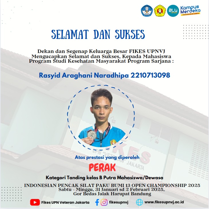 FIKES UPNVJ – Dekan dan Segenap Keluarga Besar FIKES UPN "Veteran" Jakarta Mengucapkan Selamat & Sukses Kepada Mahasiswa Program Studi Kesehata Masyarakat Program Sarjana Rasyid Araghani Naradhipa 2210713098 Atas Perolehan Juara 3 Kejuaraan Indonesian Pencak...