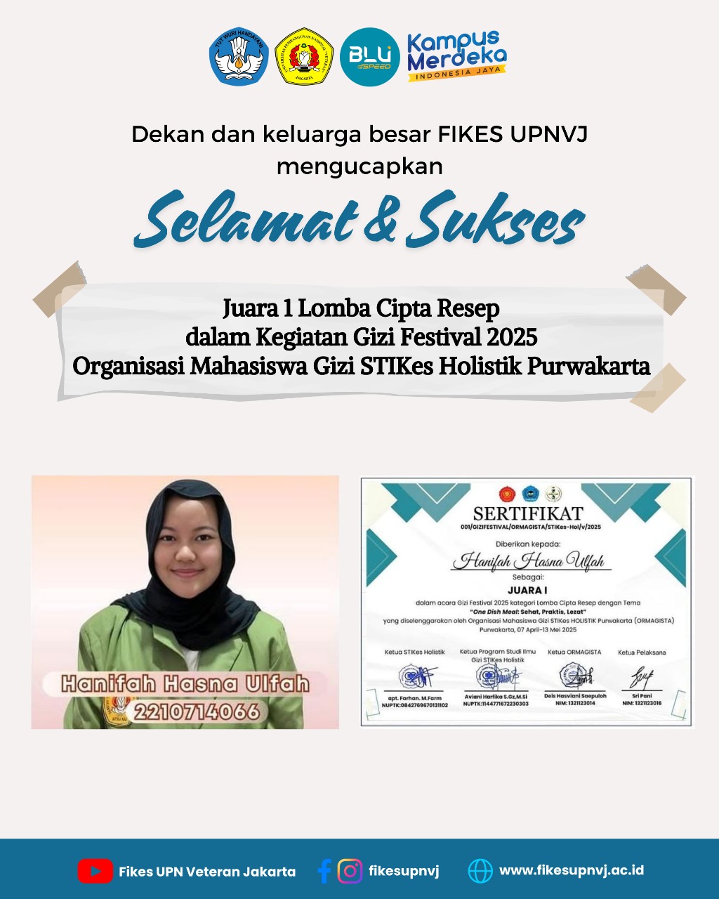 FIKES UPNVJ – Dekan dan Civitas Akademik Fakultas Ilmu Kesehatan UPN "Veteran" Jakarta mengucapkan Selamat dan Sukses Kepada Mahasiswi Program Studi Gizi Program Sarjana Fairuz Nur Anggarawati 2110714090 atas Perolehan Juara 1 Bidang Pangan...