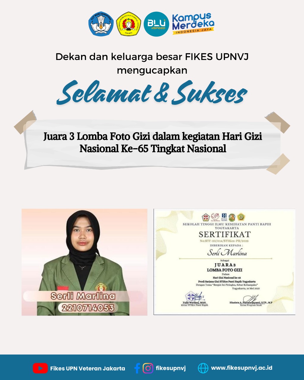 FIKES UPNVJ – Dekan dan Civitas Akademik Fakultas Ilmu Kesehatan UPN "Veteran" Jakarta mengucapkan Selamat dan Sukses Kepada Mahasiswi Program Studi Gizi Program Sarjana Serli Marlina 2210714053 atas Perolehan Juara 3 Lomba Foto Gizi dalam...