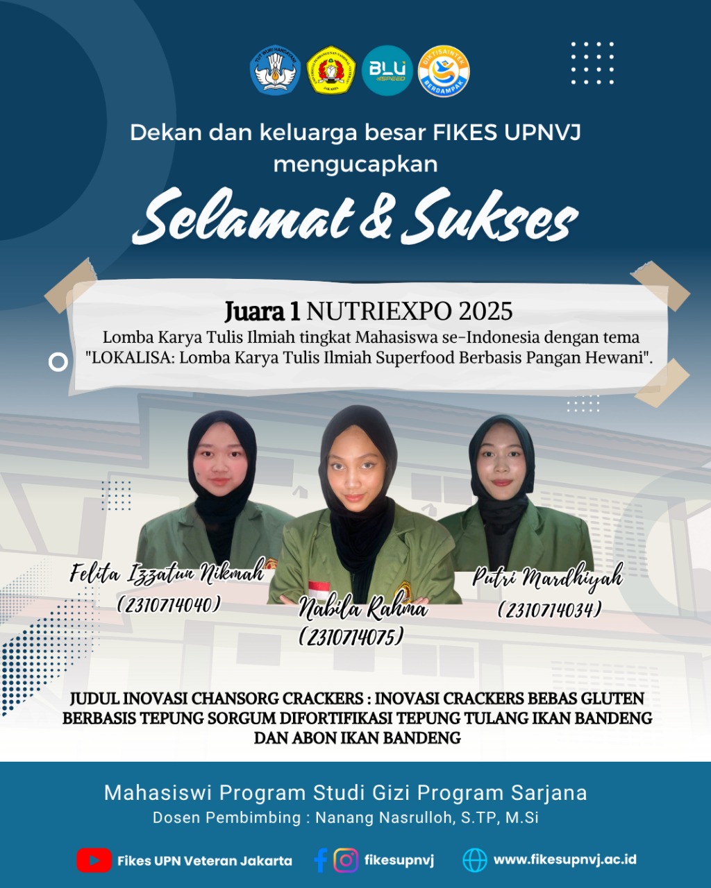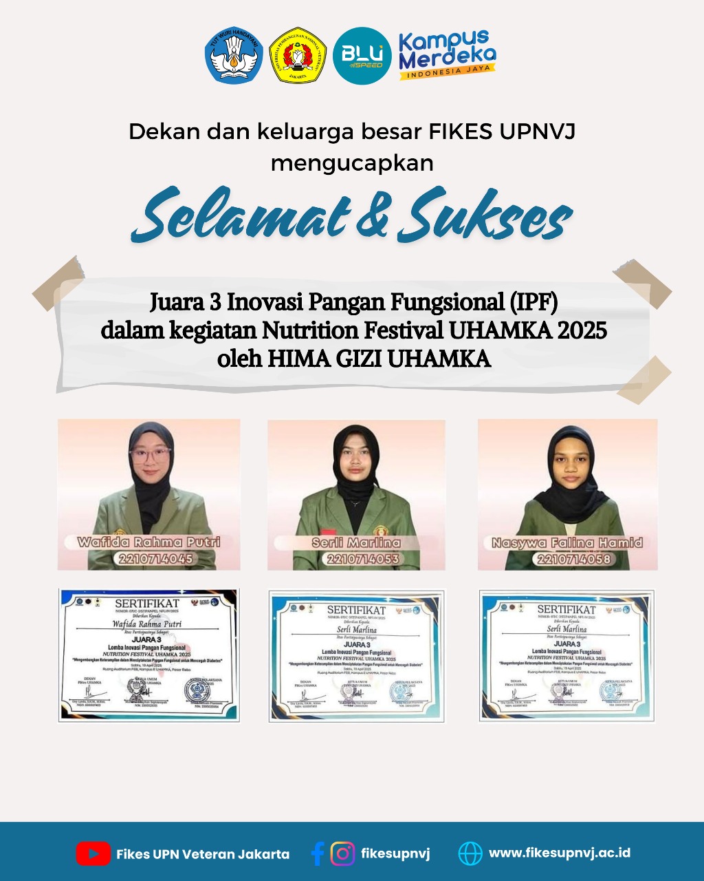 FIKES UPNVJ – Dekan dan Civitas Akademik Fakultas Ilmu Kesehatan UPN "Veteran" Jakarta mengucapkan Selamat dan Sukses Kepada Mahasiswi Program Studi Gizi Program Sarjana 1. Wafida Rahma Putri 2210714045 2. Serli Marlina 2210714053 3....