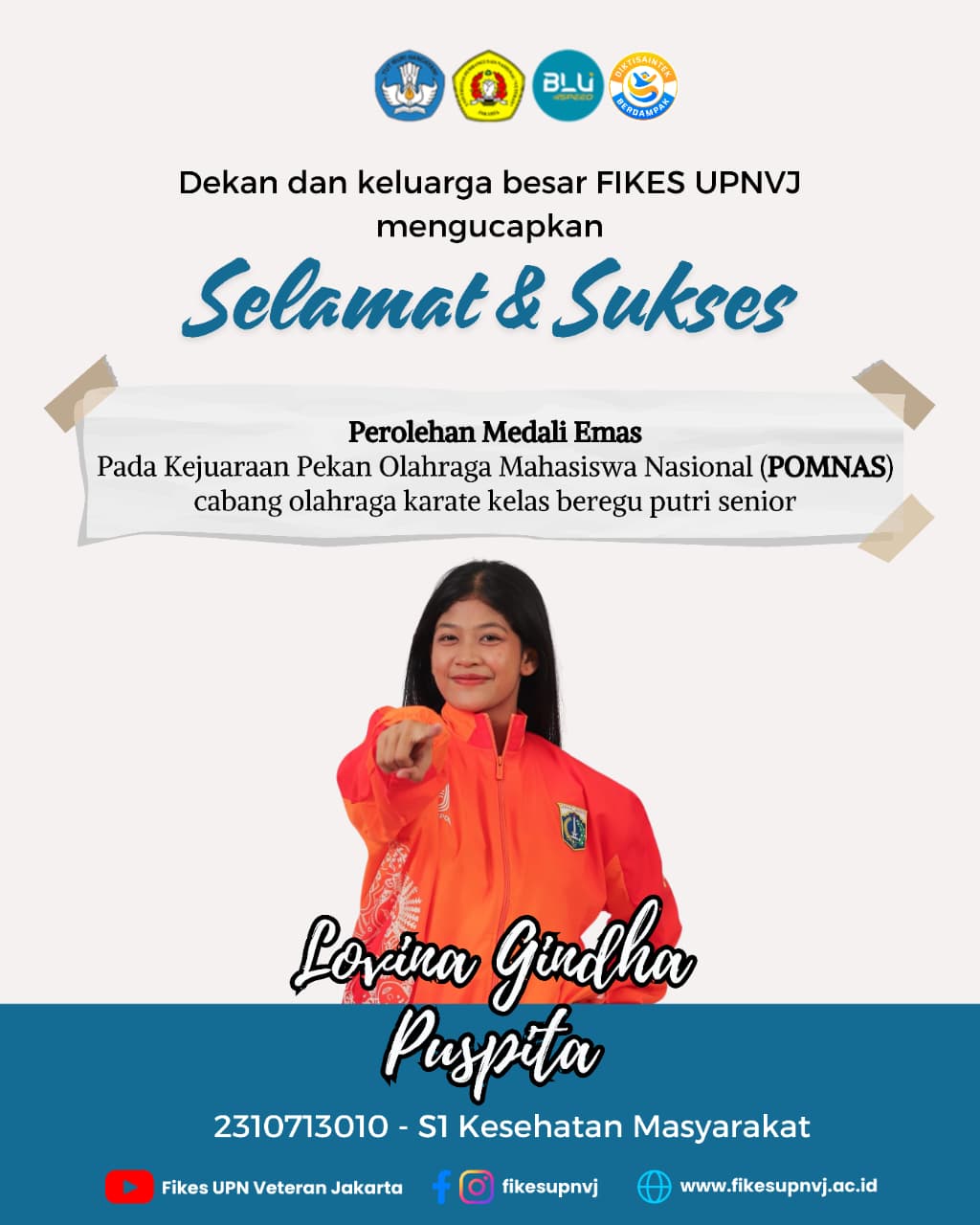 FIKES UPNVJ – Dekan dan Keluarga Besar FIKES UPN "Veteran" Jakarta Mengucapkan Selamat dan Sukses Kepada Lovina Gindha Puspita 2310713010 Mahasiswi Program Studi Kesehatan Masyarakat Program Sarjana Perolehan Medali Emas...