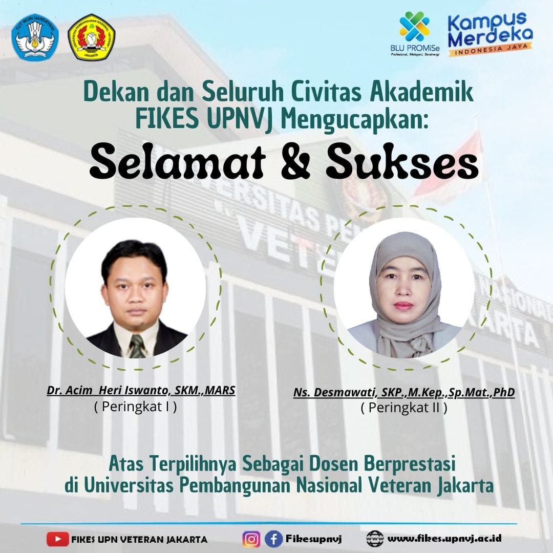 FIKES UPNVJ - Dekan dan Seluruh Civitas Akademik Fakultas Ilmu Kesehatan UPN Veteran Jakarta mengucapkan Selamat dan Sukses Kepada Desmawati, SKp. M.Kep. Sp.Mat, PhD dan Dr. Ns. Dyah Utari, S.Kep, MKKK Atas pencapaian sebagai Dosen Beprestasi...