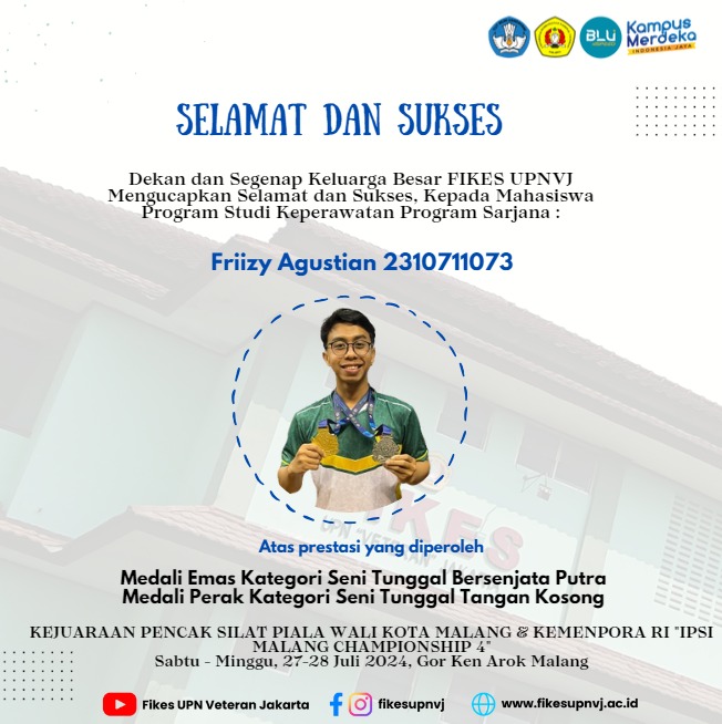 FIKES UPNVJ – Dekan dan Segenap Keluarga Besar FIKES UPN "Veteran" Jakarta Mengucapkan Selamat dan Sukses, Kepada Mahasiswa Program Studi Keperawatan Program Sarjana Friizy Agustian 2310711073 Atas prestasi yang diperoleh Medali Emas Kategori Seni Tunggal...