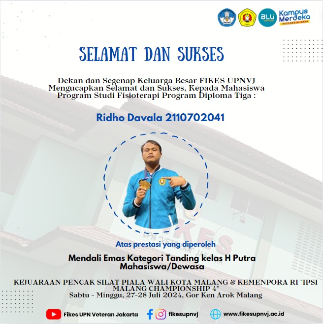 FIKES UPNVJ – Dekan dan Segenap Keluarga Besar FIKES UPN "Veteran" Jakarta Mengucapkan Selamat dan Sukses, Kepada Mahasiswa Program Studi Fisioterapi Program Diploma Tiga Ridho Davala 2110702041 Atas prestasi yang diperoleh Mendali EMAS Kategori Tanding...