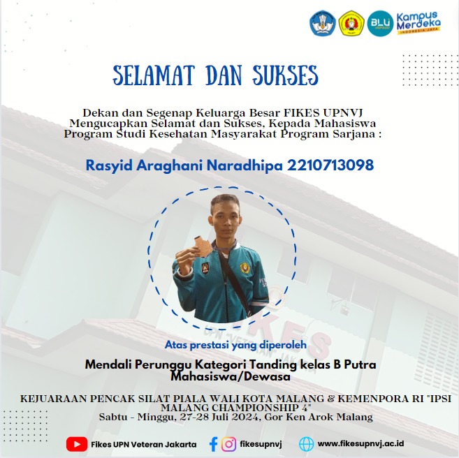 FIKES UPNVJ – Dekan dan Segenap Keluarga Besar FIKES UPN "Veteran" Jakarta Mengucapkan Selamat dan Sukses, Kepada Mahasiswa Program Studi Kesehatan Masyarakat Program Sarjana Rasyid Araghani Naradhipa 2210713098 Atas prestasi yang diperoleh Mendali Perunggu...