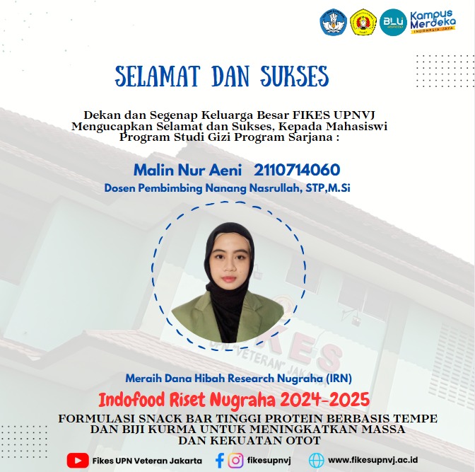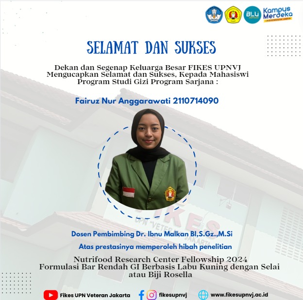 FIKES UPNVJ – Dekan dan Keluarga Besar Fakultas Ilmu Kesehatan UPN "Veteran" Jakarta mengucapkan Selamat Dan Sukses Fairuz Nur Anggarawati Dosen Pembimbing Dr. Ibnu Malkan BI,S.Gz.,M.Si Atas prestasinya memperoleh hibah penelitian Nutrifood Research...