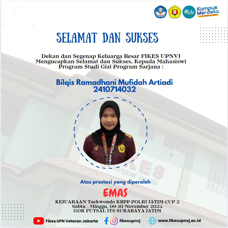 FIKES UPNVJ – Dekan Dan Keluarga Besar Fakultas Ilmu Kesehatan UPN "Veteran" Jakarta mengucapkan Selamat dan Sukses, Kepada Mahasiswi Program Studi Gizi Program Sarjana Bilqis Ramadhani Mufidah Artiadi 2410714032...