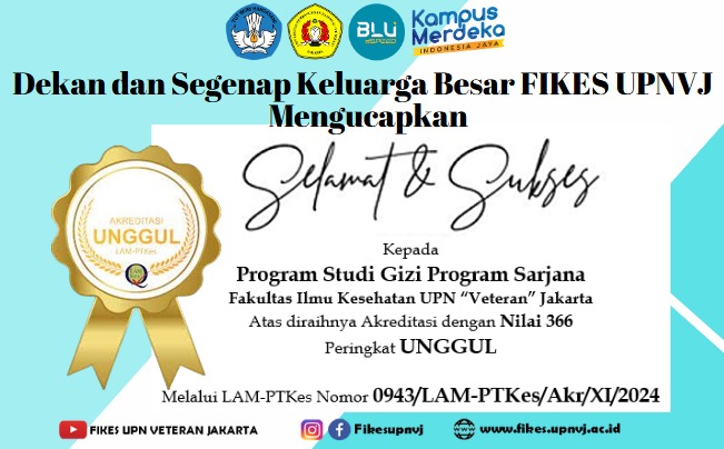 FIKES UPNVJ – Berdasarkan dengan SK LAM-PTKes Nomor 0943/LAM-PTKes/Akr/Sar/XI/ 2024 tentang Status, Nilai, dan Peringkat Akreditasi Program Studi Sarjana Gizi Universitas Pembangunan Nasional "Veteran" Jakarta telah dinyatakan meraih predikat akreditasi UNGGUL....