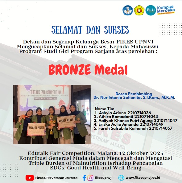 FIKES UPNVJ – Dekan dan Segenap Keluarga Besar FIKES UPN "Veteran" Jakarta Mengucapkan Selamat dan Sukses, Kepada Mahasiswi Program Studi Gizi Program Sarjana atas perolehan Bronze Medal yang didampingi Dosen Pembimbing Dr. Nur...