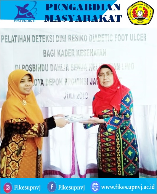 Fakultas Ilmu Kesehatan – Pada Hari Kamis, tanggal 25 Juli 2019, Dosen Keperawatan Fakultas Ilmu kesehatan Universitas Pembangunan Nasional "Veteran" Jakarta dan Mahasiswa S1 Keperawatan Fakultas Ilmu kesehatan Universitas Pembangunan Nasional "Veteran" Jakarta telah melaksanakan Pengabdian Masyarakat Tentang Pelatihan Deteksi Dini Diabetic Food Ulcer Bagi kader Kesehatan di posbindu Dahlia Senja Kelurahan Limo Kota Depok Jawa Barat. yang dihadiri oleh kurang lebih 20 kader kesehatan dari kurang 6 RW kelurahan Limo.