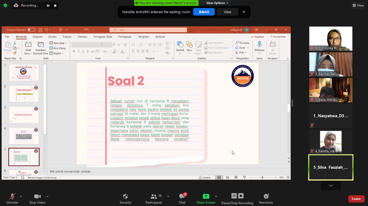 FIKES UPNVJ - Kegiatan BRAINSTORMING ini diadakan dalam rangka melatih kerja sama serta menyatukan anggota KSM BATAVIA, terutama antar profesi. Di BRAINSTORMING ini para peserta akan dilatih dalam menyelesaikan permasalahan yang diberikan berdasarkan profesinya masing-masing. Selain itu, para peserta juga diharapkan dapat memahami tugas-tugas rekan antar profesinya.