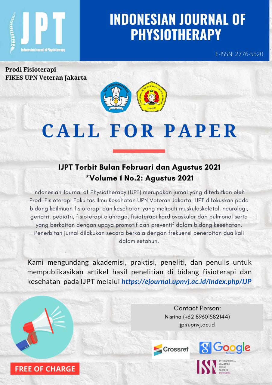 FIKES UPNVJ - Indonesian Journal of Physiotherapy (IJPT) merupakan jurnal yang diterbitkan oleh Program Studi Fisioterapi, Fakultas Ilmu Kesehatan, Universitas Pembangunan Nasional Veteran Jakarta pada tahun 2021. IJPT difokuskan pada bidang keilmuan fisioterapi dan kesehatan, yang meliputi muskuloskeletal, neurologi, geriatri, pediatri, fisioterapi olahraga, fisioterapi kardiovaskular dan pulmonal, serta yang berkaitan dengan upaya promotif dan preventif pada bidang kesehatan. Penerbitan jurnal dilakukan secara berkala dengan frekuensi penerbitan dua kali dalam setahun, yaitu pada bulan Februari dan Agustus. IJPT telah memiliki e-ISSN 2776-5520, terindeks Google Scholar dan Crossref. Kami mengundang akademisi, praktisi, peneliti, dan penulis untuk mempublikasikan artikel hasil penelitian di bidang fisioterapi dan kesehatan pada IJPT melalui laman berikut: https://ejournal.upnvj.ac.id/index.php/IJP/index.