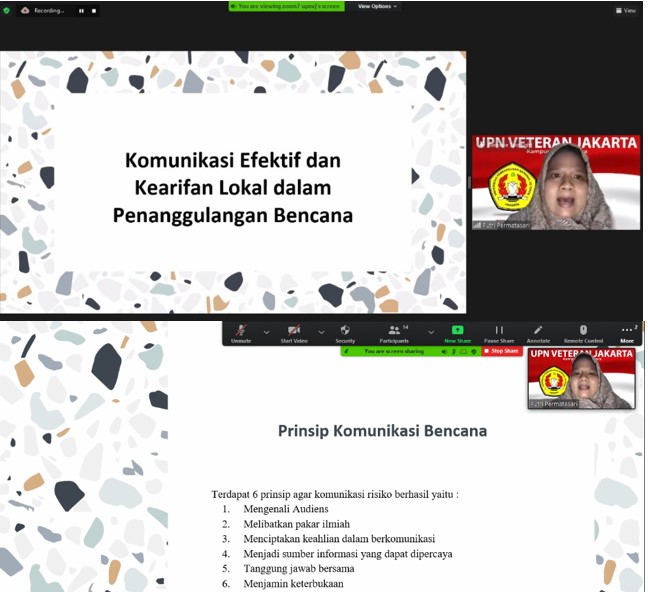 FIKES UPNVJ - Kegiatan workshop Tim Siaga Bencana sesi dua juga telah terlaksana dengan baik pada Kamis, 24 Juni 2021. Pada sesi ke dua topik yang dibawakan salah satunya , yaitu komunikasi aktif dalam penanggulangan bencana yang dipaparkan oleh Ibu Putri Permatasari, SKM, MKM.