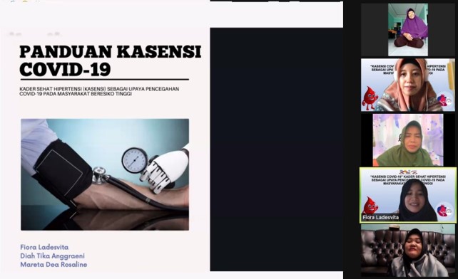 Acara ini diikuti oleh kader posbidu dahlia senja yang berjumlah 28 orang melalui zoom meeting. Pada awal kegiatan dilakukan pre test terkait pengetahuan hipertensi dan covid 19. Pendidikan kesehatan mengenai kader sehat hipertensi dan peranan kader sehat hipertensi di masa pandemi COVID 19 disampaikan oleh Ns. Fiora Ladesvita, M.Kep.Sp.MB dan materi mengenai senam hipertensi disampaikan oleh Ns. Mareta Dea Rosaline M.Kep. Peserta sangat antusias mengikuti jalannya acara yang diakhiri dengan senam hipertensi bersama secara dan post tes serta penyerahan souvenir untuk posyandu. Untuk monitoring dan evaluasi kader sehat hipertensi akan dilakukan saat pertemuan rutin kader di bulan selanjutnya.