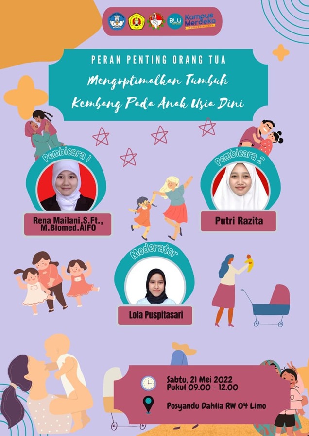 FIKES UPNVJ – Pada Sabtu, 21 Mei 2022 telah dilaksanakan Pengabdian kepada Masyarakat oleh Mahasiswa Program Studi Fisioterapi Program Diploma Tiga FIKES UPN Veteran Jakarta dalam rangka memenuhi tugas akhir mata kuliah komunikasi profesi dengan dosen pembimbing Ibu Rena Mailani, S.Ft., M.Biomed., AIFO. Kegiatan pengabdian kepada masyarakat yang dilakukan oleh mahasiswa semester 2 pada Program Studi Fisioterapi Program Diploma Tiga ini mengambil tema “Peran Penting Orang Tua Mengoptimalkan Tumbuh Kembang Pada Anak Usia Dini”. Kegiatan ini diselenggarakan untuk memberikan informasi dan edukasi kepada Ibu-ibu Posyandu Dahlia RW 04 mengenai bagaimana cara mendidik pada anak sejak usia dini. Kegiatan ini berlangsung pada pukul 09.00 hingga 12.00 WIB secara langsung. Kegiatan ini diikuti oleh 20 peserta yang terdiri dari ibu-ibu serta para kader Posyandu Dahlia RW 04.