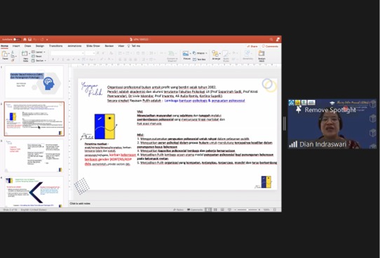 PEMBICARA 1 : Ibu Dian Indraswari, M.Psi (Direktur Eksekutif Yayasan Pulih) Beliau membahas terkait “Kekerasan Berbasis Gender” dimana kekerasan bukan hanya dapat dialami oleh perempuan saja namun juga oleh laki-laki.