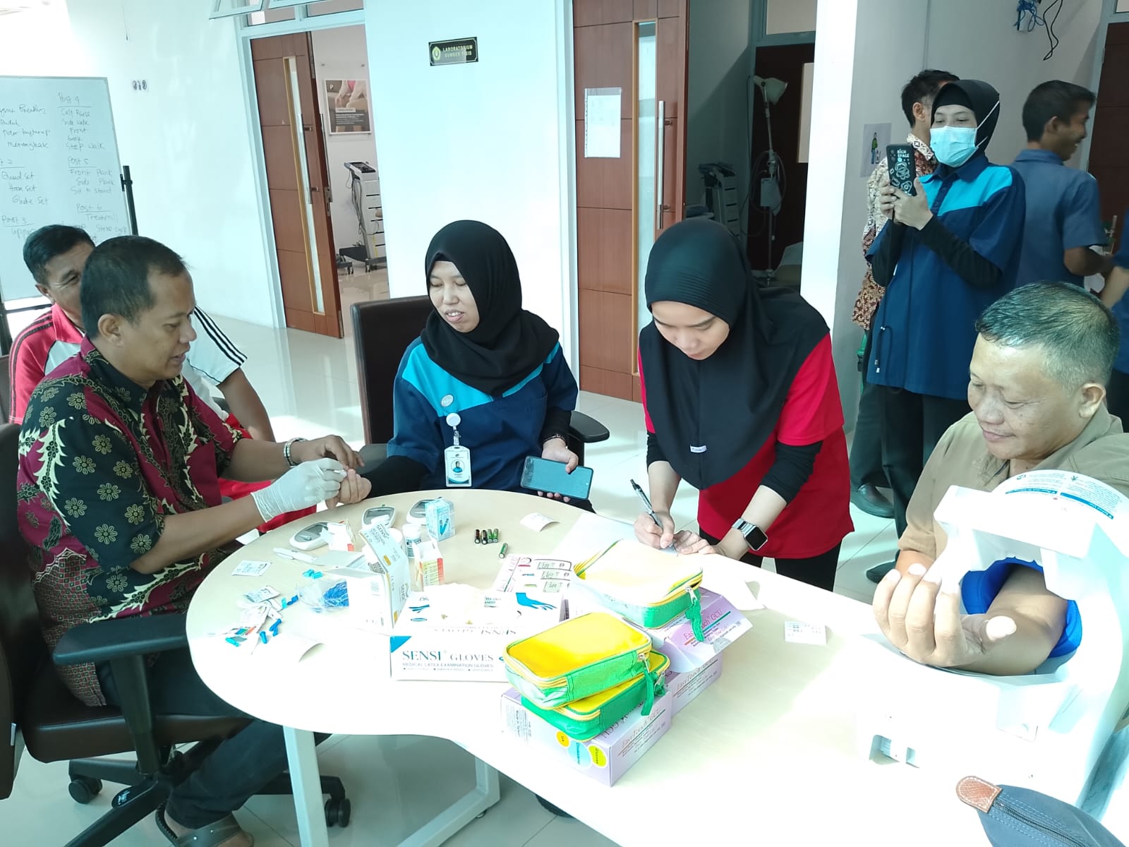 FIKES UPNVJ – Pada hari Jumat tanggal 28 Juni 2024, Laboratorium Fisioterapi melaksanakan pemeriksaan kesehatan meliputi indeks massa tubuh (IMT), tekanan darah, denyut nadi, gula darah, kolesterol dan asam urat. Pemeriksaan kesehatan dilakukan dalam rangka melaksanakan tri dharma perguruan tinggi dan pemanfaatkan alat laboratorium yang dimiliki oleh Jurusan Fisioterapi. Pemeriksaan kesehatan dilakukan terhadap 26 personil Fakultas Ilmu Kesehatan UPN "Veteran" Jakarta yang terdiri dari dosen (11,5 %), tendik (53,8 %), petugas kebersihan (19,2 %) dan petugas keamanan (15,4 %). Hasil dari pemeriksaan indeks massa tubuh didapati hasil personil yang memiliki IMT underweight sebanyak 8 %, normal 36 %, overweight 40 % dan obesitas 16 %.