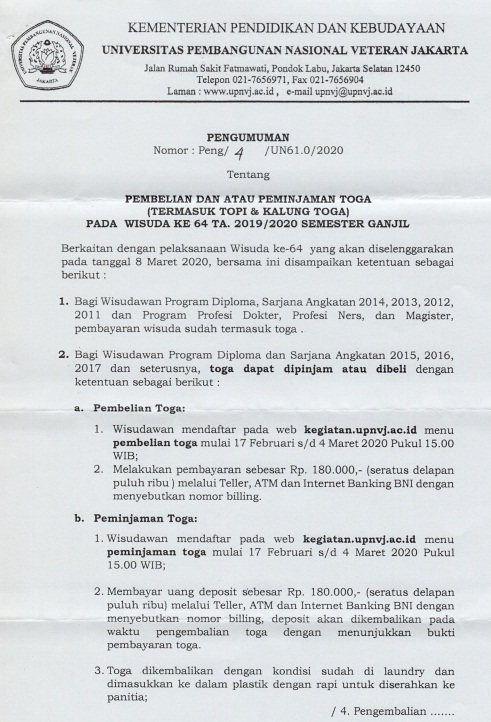 Pembelian atau Peminjaman Baju Toga February 13, 2020 Admin 0 Share Good ThingsFIKES UPN VJ – Fakultas Ilmu Kesehatan Pada Hari kamis tanggal 13 Februari 2020 diberitahukan kepada seluruh alumni yang ingin membeli Baju Toga ataupun Meminjam dapat di lihat dibawah ini terlampir: Post Views: 20