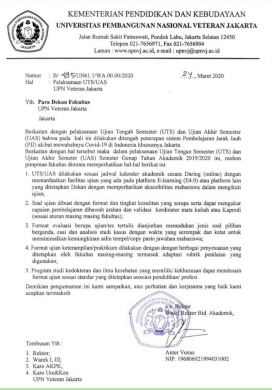 FIKES UPNVJ – Berdasarkan Nomor surat B/495/UN61.1/WA.00.00/2020 tentang Pelaksanaan Jadwal Ujian Tengah Semester (UTS) dan Ujian Akhir Semester (UAS) Semester Genap TA. 2019/2020 surat terlampir