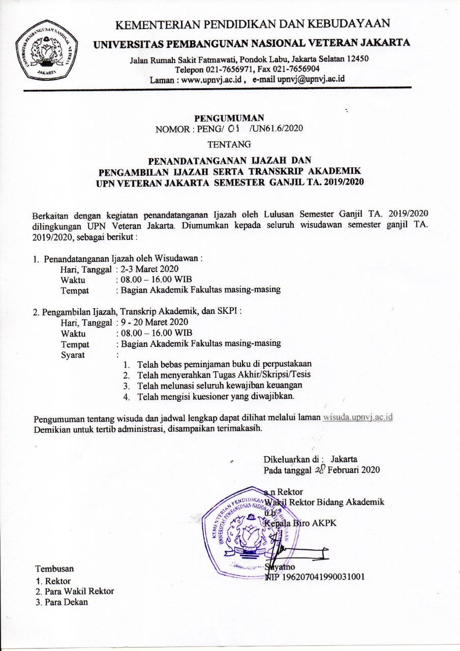 FIKES UPNVJ – Menurut Nomor : PENG/01/UN61.6/2020 tentang Penandatanganan Ijasah dan Pengambilan Ijasah Serta Transkip Akademik UPN Veteran Jakarta Semester Ganjil TA. 2019/2020 surat terlampir dibawah ini :