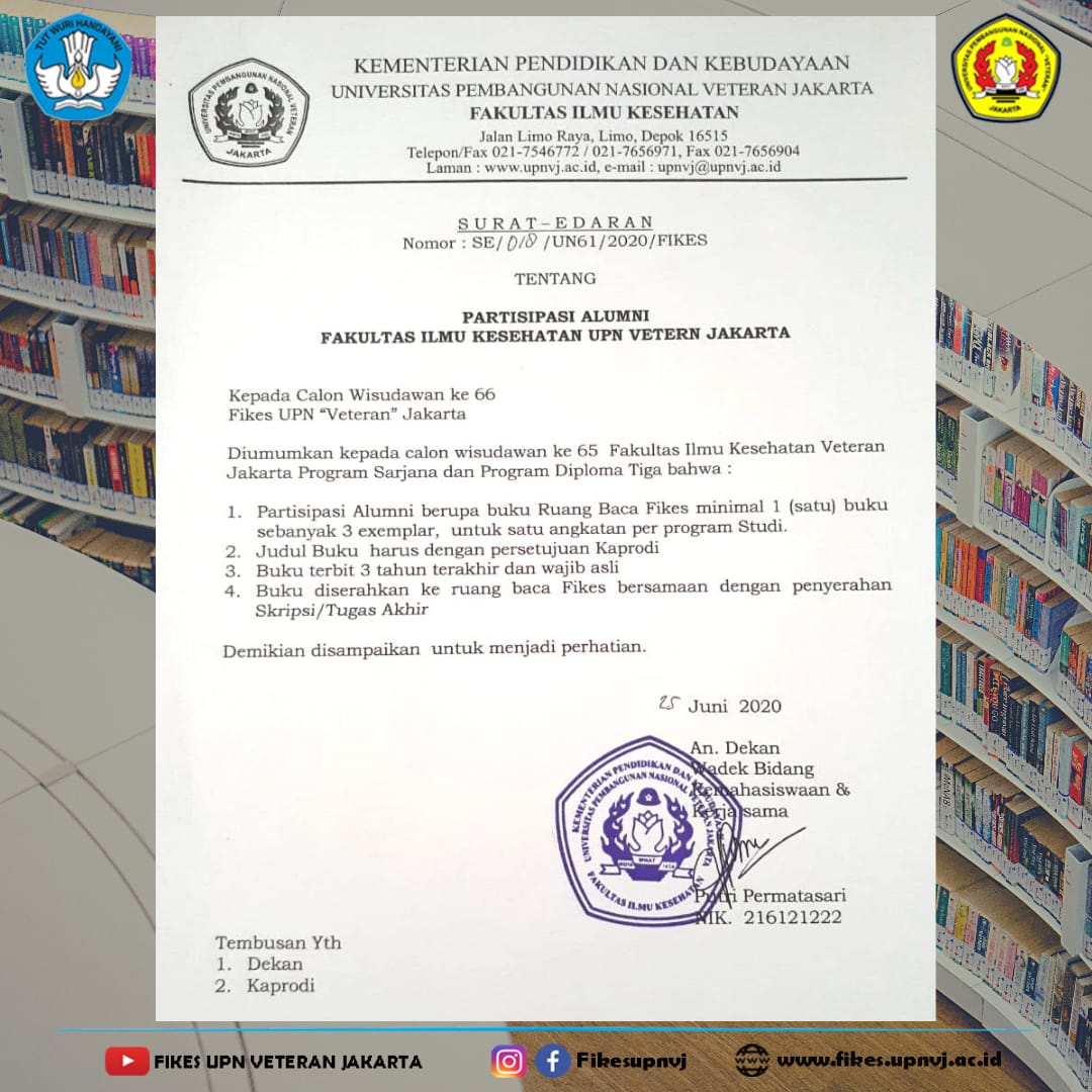 Partisipasi Alumni Wisuda Ke 66 FIKES UPNVJ July 21, 2020 Admin 0 Share Good ThingsFIKES UPNVJ – Berdasarkan Surat Edaran Nomor : SE/018/UN61/2020/FIKES tentang Partisipasi Alumni Fakultas Ilmu Kesehatan Universitas Pembangunan Nasional Veteran Jakarta,surat Edaran terlampir dibawa ini Post Views: 15