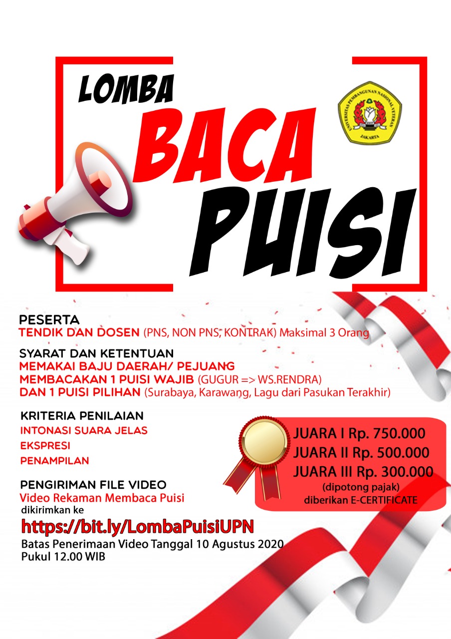FIKES UPNVJ – Dalam Rangka memeriahkan acara HUT – Ke 75 Lomba Baca Puisi Bagi Seluruh Peserta (Tenaga Kependidikan (Tendik) dan Tenaga Pendidik (Dosen) ) yang ingin ikut berpatisipasi silakan upload di link dibawah ini