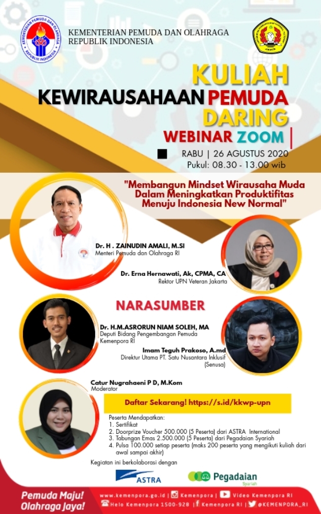 FIKES UPNVJ – Bagi Seluruh mahasiswa Fakultas Ilmu Kesehatan Universitas Pembangunan Nasional Veteran Jakarta yang ingin ikut kegiatan Webinar Kuliah Kewirausahaan Pemuda Daring, sangat bermanfaat dan ada dorprizenya juga. Dan untuk 200 peserta yang join di awal serta tetap join sampai akhir akan mendapatkan pulsa senilai Rp 100.000,- loh…