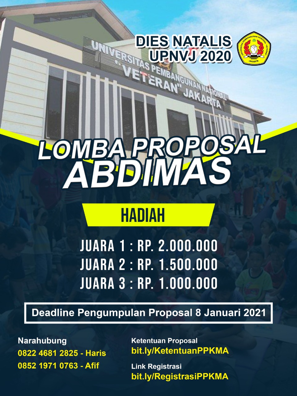 FIKES UPNVJ – Hallo Seluruh Mahasiswa UPN Veteran Jakarta! 👩🎓👨🎓. Dalam rangka Dies Natalis Ke-58 Universitas Pembangunan Nasional Veteran Jakarta 2020, UPN Veteran Jakarta menyelenggarakan Lomba Proposal PKM – Abdimas bagi seluruh mahasiswa UPN Veteran Jakarta✨✨