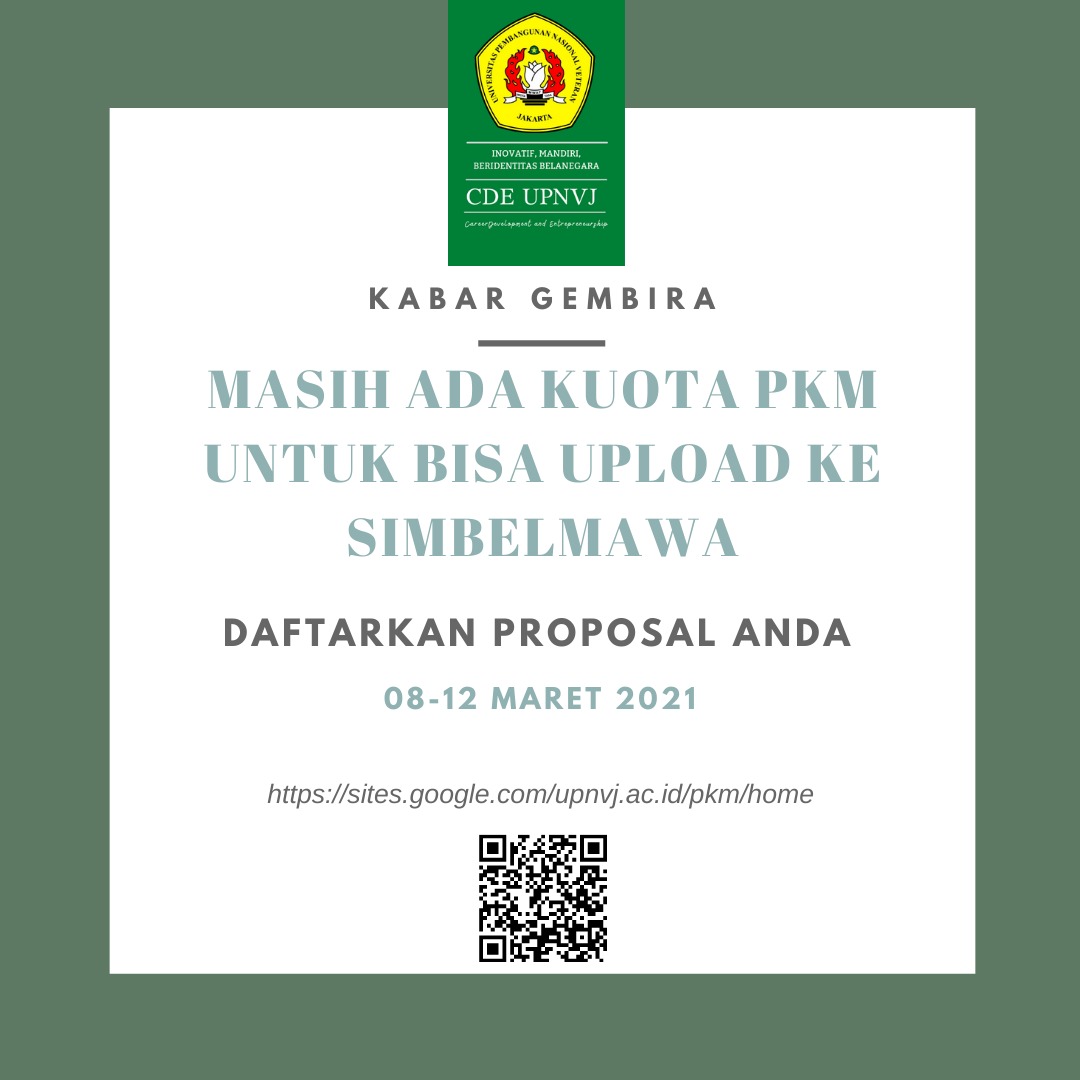 FIKES UPNVJ – Bagi seluruh mahasiswa Fakultas Ilmu Kesehatan UPN Veteran Jakarta yang ingin berpatisipasi dalam Rangka Program Kreativitas Mahasiswa (PKM). Masih ada kuota PKM silakan upload ke SIMBELMAWA klik link berikut ini https://sites.google.com/upnvj.ac.id/pkm/home