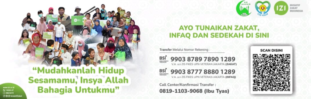 Mari Tunaikan Zakat, Infak dan Sodaqoh Bapak/Ibu melalui DKM ALFikri bekerjasama dengan ZIS FIKES UPN Veteran Jakarta dibawah Pembinaan LAZNAS Inisiatif Zakat Indonesia (IZI). Hasil Zakat dan Infak akan disalurkan bagi orang-orang yang tidak mampu di sekitar wilayah UPN Veteran Jakarta.