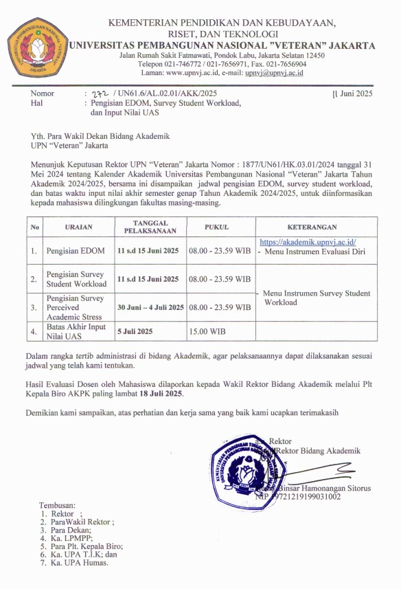 FIKES UPNVJ – Menunjuk Keputusan Rektor UPN "Veteran" Jakarta Nomor: 1877/UN61/HK.03.01/2024 tanggal 31 Mei 2024 tentang Kalender Akademik Universitas Pembangunan Nasional "Veteran" Jakarta Tahun Akademik 2024/2025, bersama ini disampaikan jadwal pengisian EDOM, survey student workload, dan batas waktu input nilai akhir semester genap Tahun Akademik 2024/2025, untuk diinformasikan kepada mahasiswa dilingkungan fakultas masing-masing.