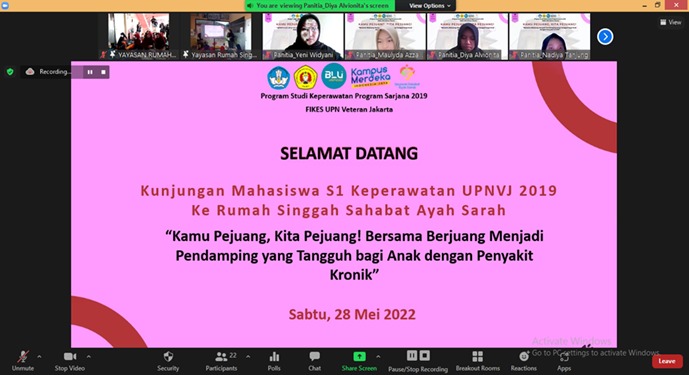 Kegiatan yang diselenggarakan tersebut mengangkat tema “Kamu Pejuang, Kita Pejuang! Bersama Berjuang Menjadi Pendamping yang Tangguh Bagi Anak Dengan Penyakit Kronik”. Kegiatan kunjungan studi lapangan ini dihadiri dan diikuti oleh orang tua/pendamping dan anak-anak penderita penyakit kronik. Acara yang dilaksanakan secara langsung di Rumah Singgah Sahabat Ayah Sarah diikuti oleh perwakilan teman-teman kelas A sedangkan untuk teman-teman lain tetap mengikuti kegiatan melalui zoom meeting. Sehingga semua mahasiswa/i tetap mendapat manfaat dari kegiatan ini.