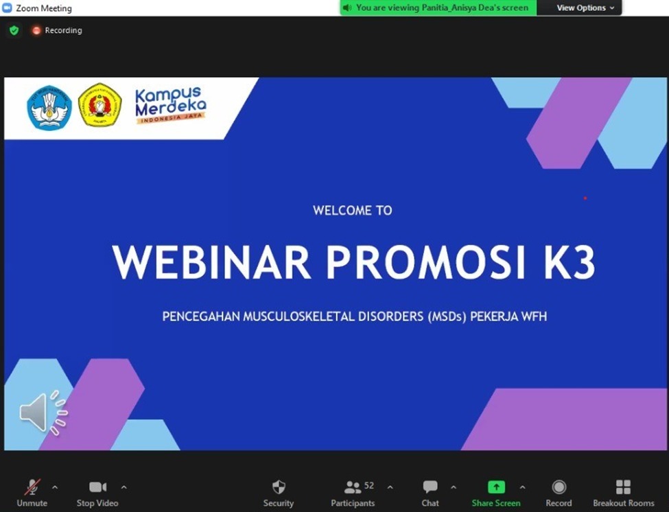 Maka dari itu, untuk mencegah terjadinya risiko MSDs bagi pekerja, Mahasiswa Program Studi Kesehatan Masyarakat menggelar webinar promosi K3 yang dilaksanakan secara daring melalui platform Zoom Meeting dengan mengangkat tema “Pencegahan Musculoskeletal Disorders pada Pekerja WFH”. Program Studi Kesehatan Masyarakat dengan peminatan Keselamatan dan Kesehatan Kerja (K3) memiliki peran dalam melakukan promosi kesehatan pada pekerja di masa pandemi Covid-19 untuk meminimalisir risiko Musculoskeletal Disorders (MSDs) pada pekerja selama WFH. Oleh karena itu, pada hari Kamis, 26 Mei 2022 kelas 6C mengadakan webinar yang diampu oleh Ibu Rizki Amalia, SKM, M.H.Sc selaku dosen mata kuliah Promosi Keselamatan dan Kesehatan Kerja. Kegiatan webinar ini diikuti oleh berbagai peserta yang terdiri dari pekerja, mahasiswa, pelajar, dan dosen.