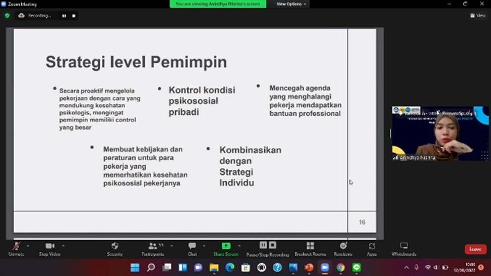 Program Kesehatan Masyarakat peminatan Kesehatan dan Keselamatan Kerja (K3) memiliki peran dalam melakukan promosi kesehatan di tempat kerja untuk menanggulangi dampak psikososial negatif untuk membuat strategi dalam membetuk psikososial positif dengan dosen pengampu mata kuliah promosi keselamatan dan kesehatan kerja yaitu Rizki Amalia SKM, MHSc,. Oleh karena itu, pada hari Minggu, 12 Juni 2022 kelas K3C mengadakan webinar yang bertemakan “Strategi Menciptakan Psikososial Positif Pada Pekerja” dengan narasumber Drs. Johan Caniago AK3U, CPHRM, CBCP dan Anindhya Nisrina Putri.