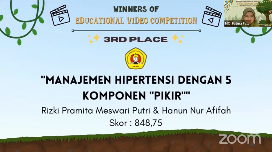 FIKES UPNVJ – RANALHECOM 2022 merupakan sebuah kegiatan yang diselenggarakan oleh HM-PSIK UPNVJ. Kegiatan ini terdiri dari serangkaian acara Webinar Internasional Keperawatan dan Lomba yang dapat diikuti oleh seluruh mahasiswa/i kesehatan se-Indonesia. Adapun tema dari kegiatan ini yaitu “Measurement of Blood Pressure: Managing Hypertension and The Threat of Complications”. Salah satu cabang perlombaan pada Ranalhecom 2022 yaitu lomba video edukasi. Perlombaan ini dilakukan pada Sabtu, 15 Oktober 2022 pukul 08.00 – 15.00 dan bertempat di Fakultas Ilmu Kesehatan UPN “Veteran” Jakarta, Kampus Limo. Pada perlombaan ini, salah satu tim berasal dari Program Studi Keperawatan Program Sarjana UPN “Veteran” Jakarta yang terdiri dari 2 mahasiswa yaitu Rizki Pramita Meswari Putri dan Hanun Nur Afifah berhasil membawa pulang juara 3 cabang lomba Video Edukasi.