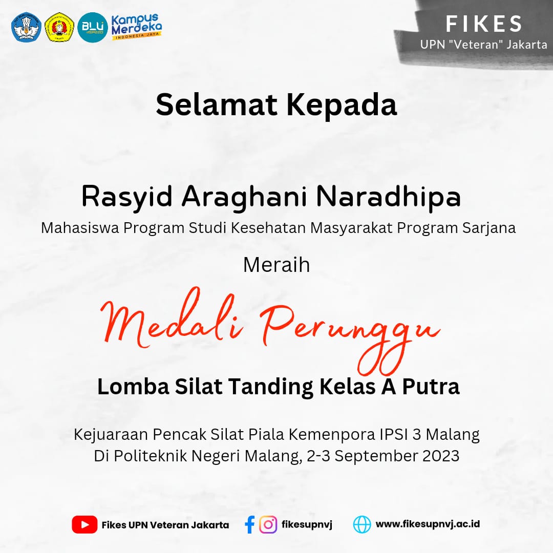 FIKES UPNVJ – Dekan dan Segenap Civitas Akademik Fakultas Ilmu Kesehatan Universitas Pembangunan Nasional "Veteran" Jakarta mengucapkan SELAMAT dan SUKSES Kepada Mahasiswi Program Studi Kesehatan Masyarakat Program Sarjana Rasyid Arghani Naradhipa 221071309 Meraih Medali Perunggu Lomba Tanding Putra A dalam Rangka Kejuaraan Pencaksilat Piala Kemenpora IPSI 3 Malang di Politeknik Negeri Malang, 2 sd 3 September 2023.