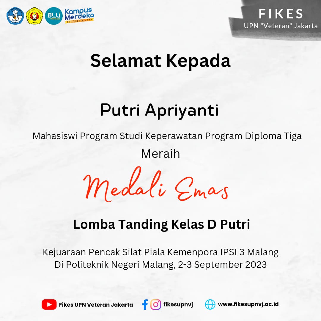 FIKES UPNVJ – Dekan dan Segenap Civitas Akademik Fakultas Ilmu Kesehatan Universitas Pembangunan Nasional "Veteran" Jakarta mengucapkan SELAMAT dan SUKSES Kepada Mahasiswi Program Studi Keperawatan Putri Apriyanti 2210701072 Meraih Medali Emas dalam Rangka Kejuaraan Pencaksilat Piala Kemenpora IPSI 3 Malang di Politeknik Negeri Malang, 2 sd 3 September 2023.