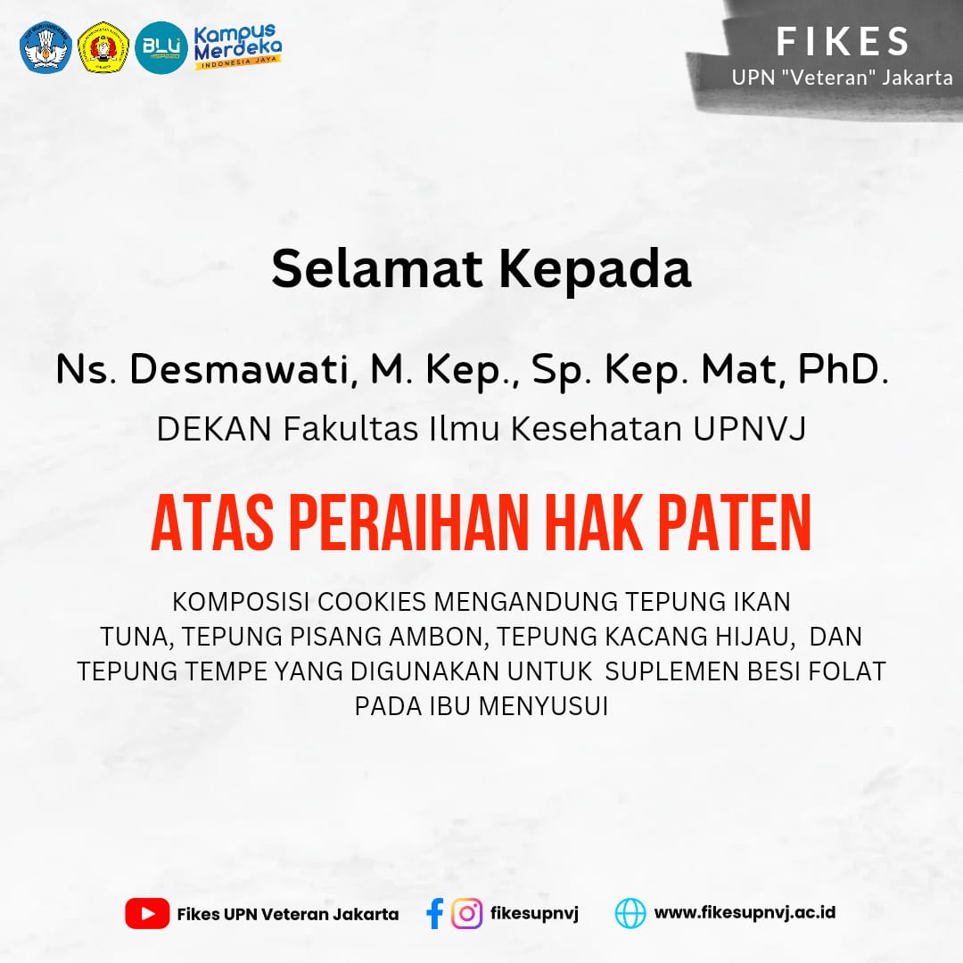 FIKES UPNVJ – Dekan dan Keluarga Besar mengucapkan Selamat kepada Ns. Desmawati, M.Kep, Sp.Kep. Mat, PhD dan Arfiyanti atas peraihan Hak Paten dengan judul Komposisi Cookies Mengandung Tepung Ikan Tuna, Tepung Pisang Ambon, Tepung Kacang Hijau dan Tepung Tempe yang digunakan untuk Suplemen Besi Folat Pada Ibu Menyusui