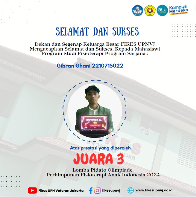 FIKES UPNVJ – Dekan dan Segenap Keluarga Besar FIKES UPNVJ Mengucapkan Selamat dan Sukses, Kepada Mahasisw aProgram Studi Fisioterapi Program Sarjana Gibran Ghani 2210715022 Atas prestasi yang diperoleh Juara 3 Lomba Pidato Olimpiade Perhimpunan Fisioterapi Anak Indonesia 2024.