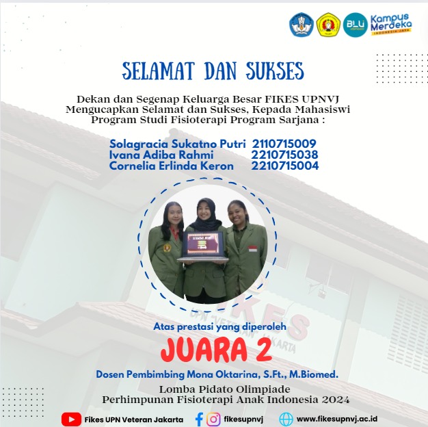 FIKES UPNVJ – Dekan dan Segenap Keluarga Besar FIKES UPNVJ Mengucapkan Selamat dan Sukses, Kepada Mahasiswi Program Studi Fisioterapi Program Sarjana Solagracia Sukatno Putri 2110715009, Ivana Adiba Rahmi 2210715038, Cornelia Erlinda Keron 2210715004 Atas prestasi yang diperoleh Juara 2 Lomba Pidato Olimpiade Perhimpunan Fisioterapi Anak Indonesia 2024 yang didampingi oleh Dosen Pembimbing Mona Oktarina, S.Ft, M.Biomed.